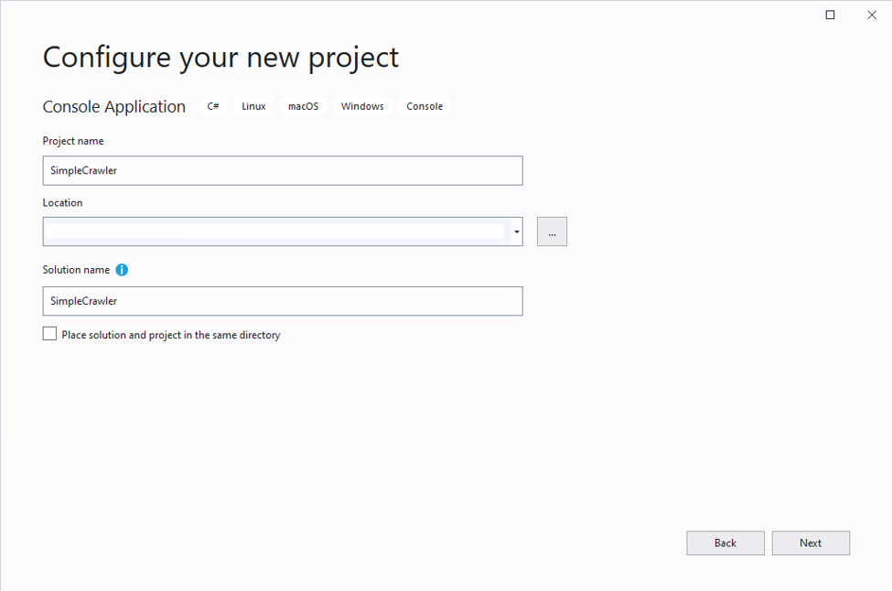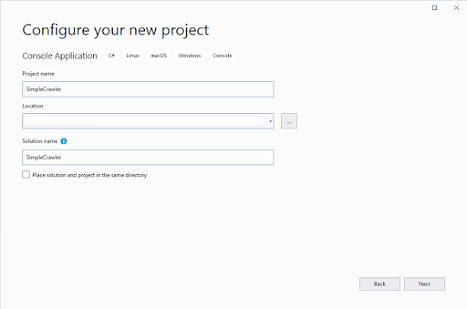 Lo primero que tenemos que hacer es un proyecto nuevo con Visual Studio. En mi caso vamos a usar Visual Studio 2019. El proyecto lo vamos a desarrollar usando C#. Vamos a hacer un Console app el cual le vamos a llamar SimpleCrawler.