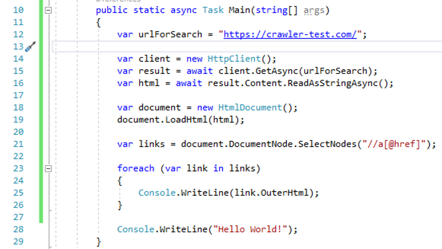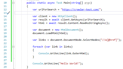 Ahora, en la línea 12 tenemos que copiar el URL de la página web que deseamos escanear. Con esto vamos a crear un cliente Http para leer el documento web como se puede ver en la línea 14. Ya en la línea 16 obtenemos el contenido del documento de Html. Este al final lo podemos obtener como si fuera una variable string.