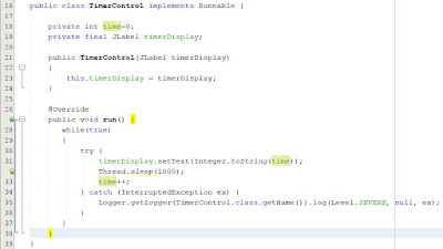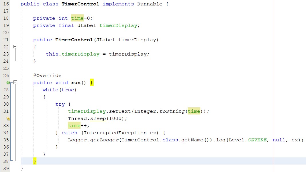 Como podemos ver en las líneas 19 se crear un objeto de tipo Thread donde vamos a pasar en el constructor un objeto de tipo TimerControl. A este se le debe pasar también el Label que vamos a usar para actualizar nuestro cronometro.