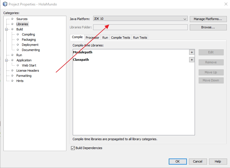 Ahora, le damos clic al botón Manage Platforms y luego al botón que dice Add Platform y buscamos donde se instaló el JDK 10.