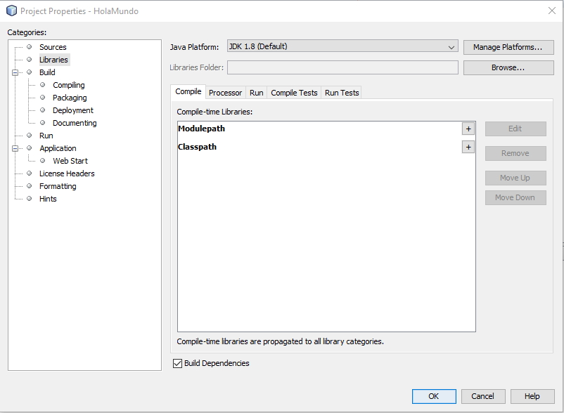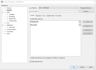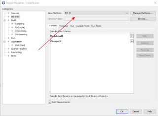 Lo ejecutamos y creamos nuestro primero proyecto de java standard. Con el proyecto listo, Le damos clic derecho sobre el proyecto y vamos a la categoría que dice Librerias.